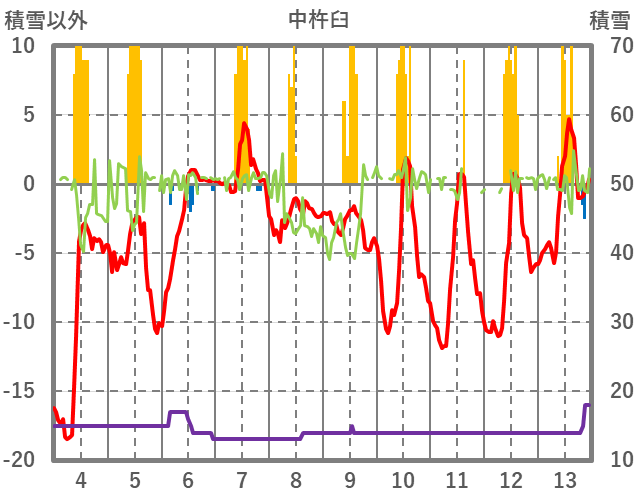 | 日 | 時 | 気温 | 降水 | 風向/風速 | 日照 | 積雪 | 降雪 |