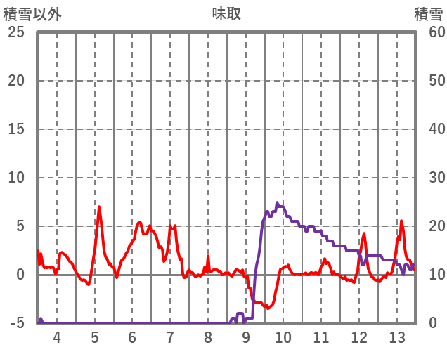 | 日 | 時 | 気温 | 降水 | 風向/風速 | 日照 | 積雪 | 降雪 |
