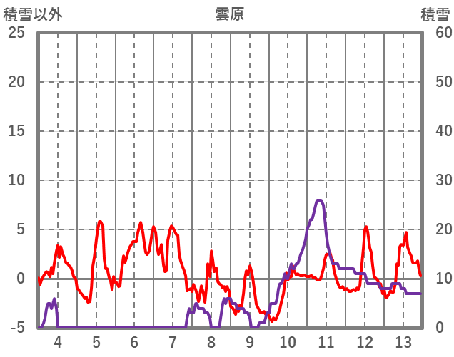 | 日 | 時 | 気温 | 降水 | 風向/風速 | 日照 | 積雪 | 降雪 |