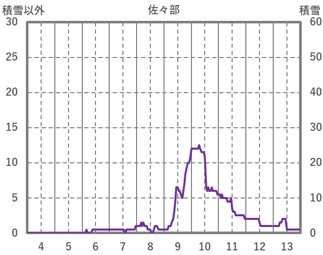 | 日 | 時 | 気温 | 降水 | 風向/風速 | 日照 | 積雪 | 降雪 |
