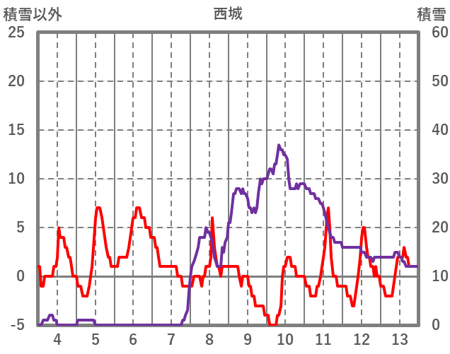 | 日 | 時 | 気温 | 降水 | 風向/風速 | 日照 | 積雪 | 降雪 |