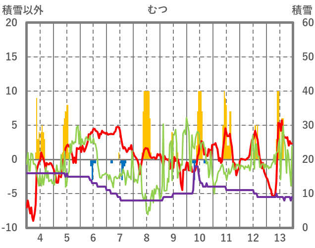 | 日 | 時 | 気温 | 降水 | 風向/風速 | 日照 | 積雪 | 降雪 |