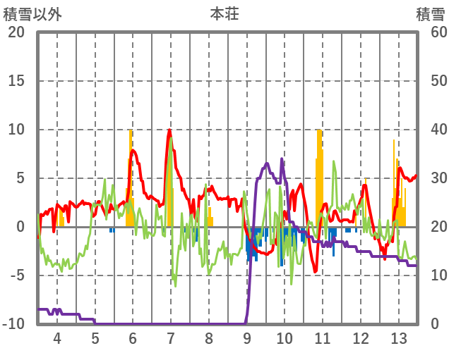 | 日 | 時 | 気温 | 降水 | 風向/風速 | 日照 | 積雪 | 降雪 |
