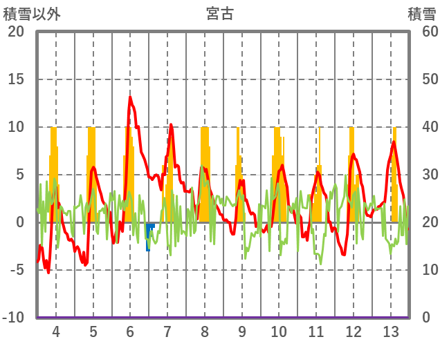 | 日 | 時 | 気温 | 降水 | 風向/風速 | 日照 | 積雪 | 降雪 |