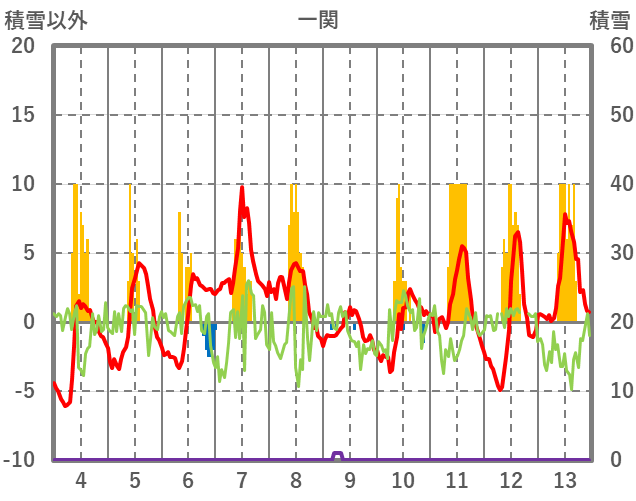 | 日 | 時 | 気温 | 降水 | 風向/風速 | 日照 | 積雪 | 降雪 |