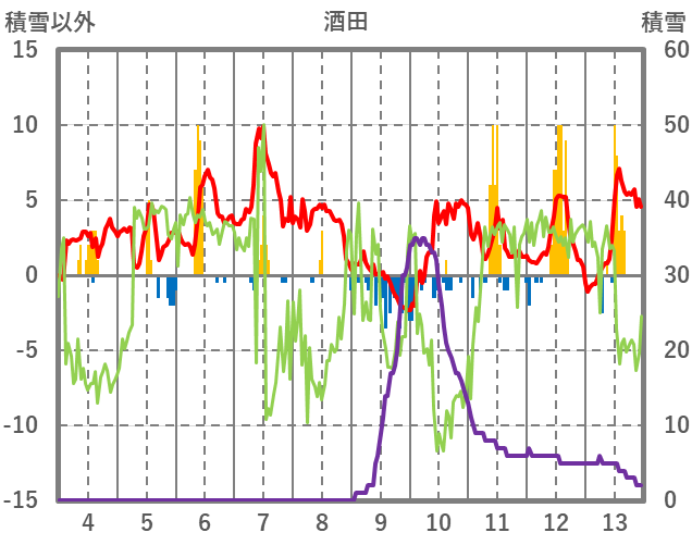 | 日 | 時 | 気温 | 降水 | 風向/風速 | 日照 | 積雪 | 降雪 |