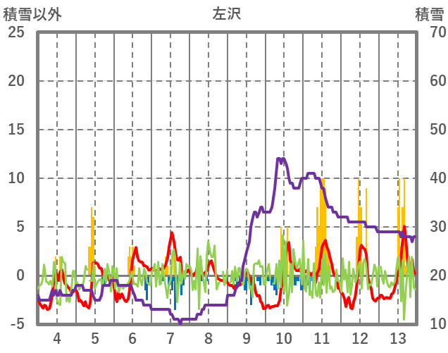 | 日 | 時 | 気温 | 降水 | 風向/風速 | 日照 | 積雪 | 降雪 |