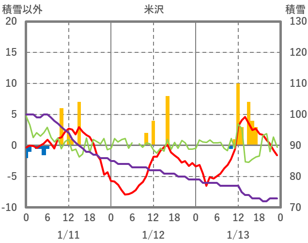 | 日 | 時 | 気温 | 降水 | 風向/風速 | 日照 | 積雪 | 降雪 |