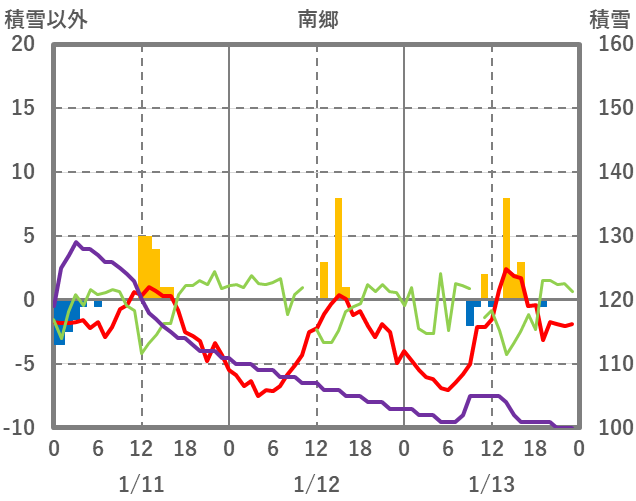 | 日 | 時 | 気温 | 降水 | 風向/風速 | 日照 | 積雪 | 降雪 |