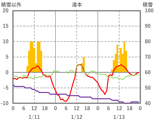 | 日 | 時 | 気温 | 降水 | 風向/風速 | 日照 | 積雪 | 降雪 |
