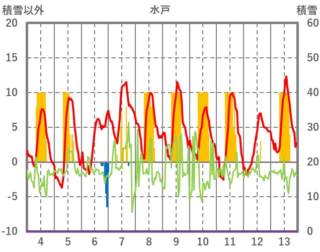 | 日 | 時 | 気温 | 降水 | 風向/風速 | 日照 | 積雪 | 降雪 |