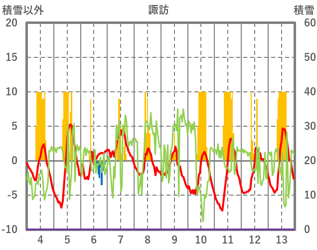 | 日 | 時 | 気温 | 降水 | 風向/風速 | 日照 | 積雪 | 降雪 |
