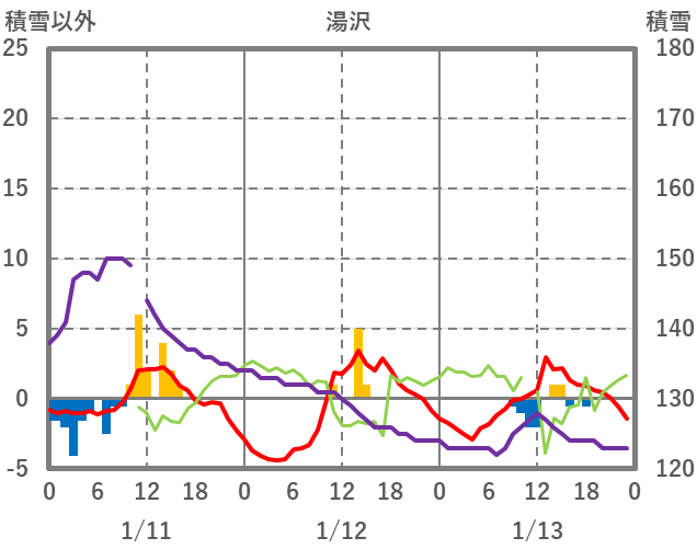 | 日 | 時 | 気温 | 降水 | 風向/風速 | 日照 | 積雪 | 降雪 |
