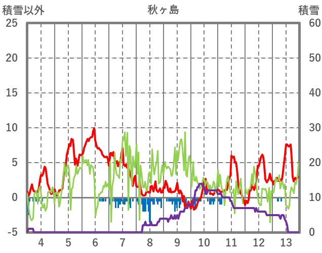 | 日 | 時 | 気温 | 降水 | 風向/風速 | 日照 | 積雪 | 降雪 |