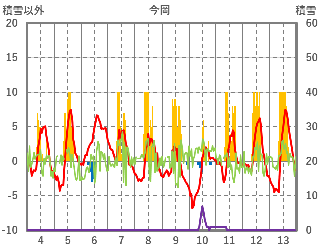 | 日 | 時 | 気温 | 降水 | 風向/風速 | 日照 | 積雪 | 降雪 |