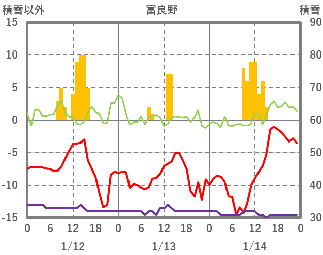 | 日 | 時 | 気温 | 降水 | 風向/風速 | 日照 | 積雪 | 降雪 |
