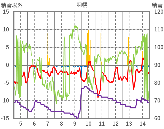 | 日 | 時 | 気温 | 降水 | 風向/風速 | 日照 | 積雪 | 降雪 |