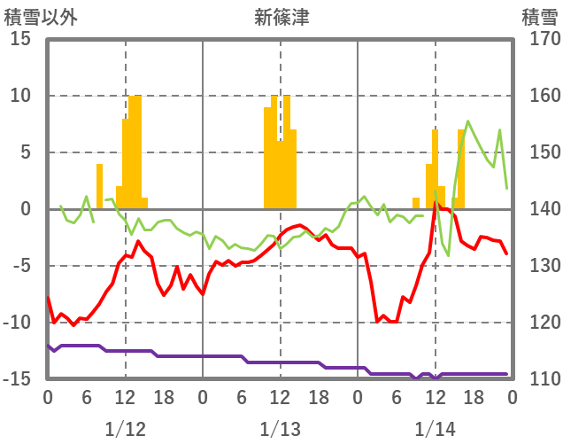 | 日 | 時 | 気温 | 降水 | 風向/風速 | 日照 | 積雪 | 降雪 |