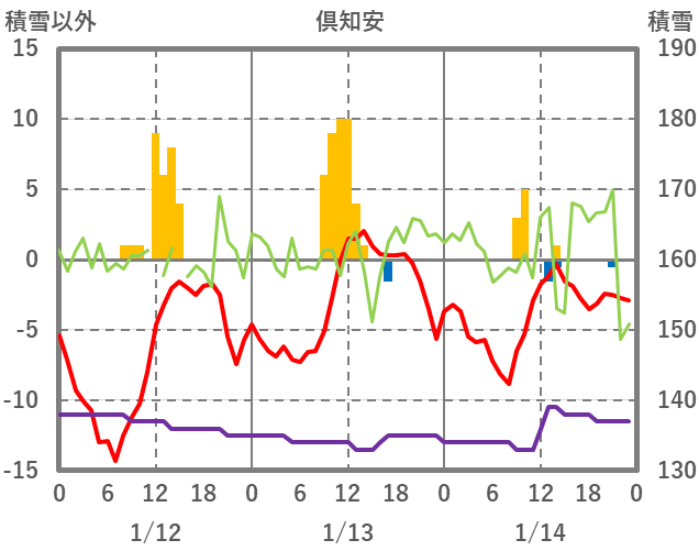 | 日 | 時 | 気温 | 降水 | 風向/風速 | 日照 | 積雪 | 降雪 |