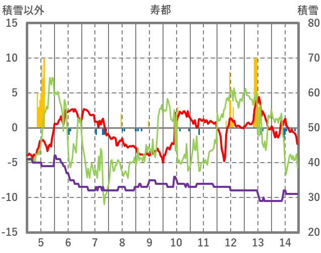 | 日 | 時 | 気温 | 降水 | 風向/風速 | 日照 | 積雪 | 降雪 |