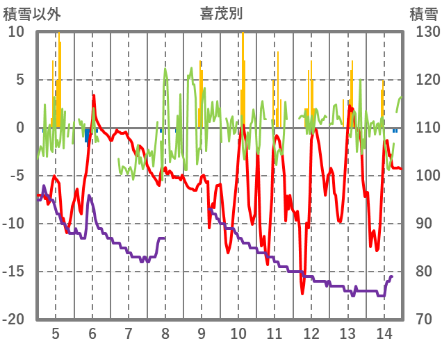 | 日 | 時 | 気温 | 降水 | 風向/風速 | 日照 | 積雪 | 降雪 |