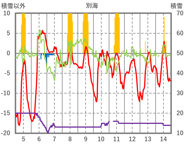 | 日 | 時 | 気温 | 降水 | 風向/風速 | 日照 | 積雪 | 降雪 |