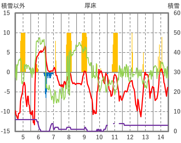 | 日 | 時 | 気温 | 降水 | 風向/風速 | 日照 | 積雪 | 降雪 |
