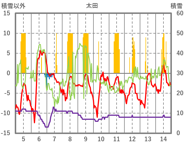| 日 | 時 | 気温 | 降水 | 風向/風速 | 日照 | 積雪 | 降雪 |