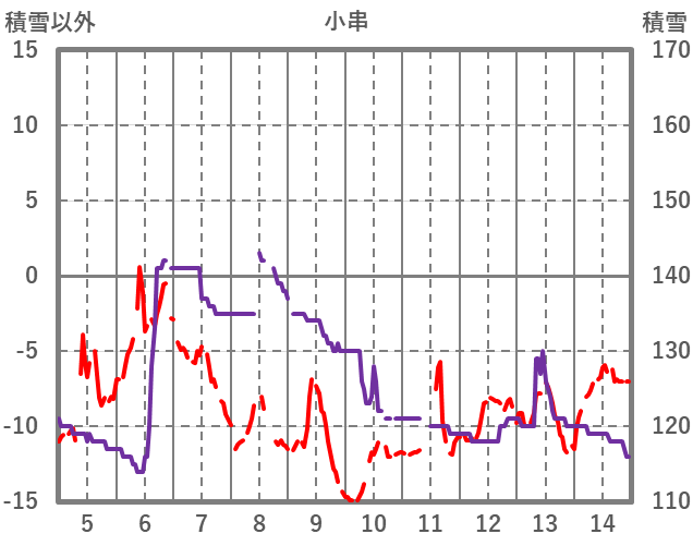 | 日 | 時 | 気温 | 降水 | 風向/風速 | 日照 | 積雪 | 降雪 |