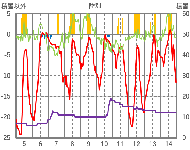 | 日 | 時 | 気温 | 降水 | 風向/風速 | 日照 | 積雪 | 降雪 |