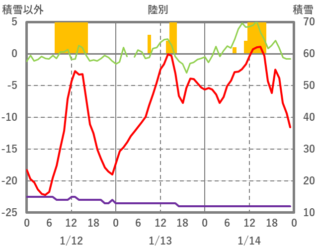 | 日 | 時 | 気温 | 降水 | 風向/風速 | 日照 | 積雪 | 降雪 |
