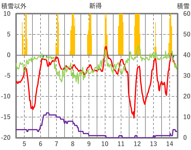 | 日 | 時 | 気温 | 降水 | 風向/風速 | 日照 | 積雪 | 降雪 |