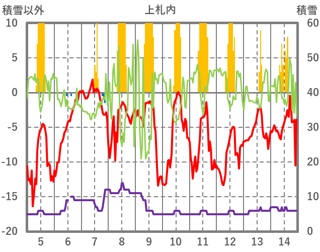 | 日 | 時 | 気温 | 降水 | 風向/風速 | 日照 | 積雪 | 降雪 |