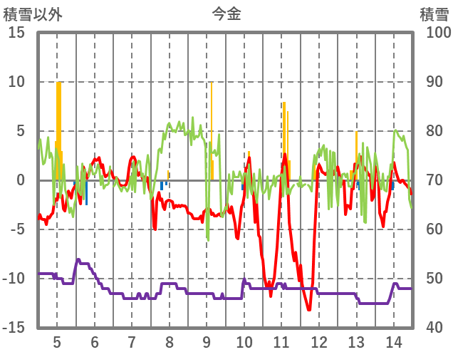 | 日 | 時 | 気温 | 降水 | 風向/風速 | 日照 | 積雪 | 降雪 |