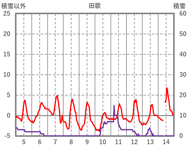 | 日 | 時 | 気温 | 降水 | 風向/風速 | 日照 | 積雪 | 降雪 |