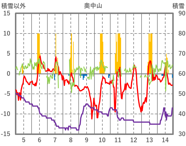| 日 | 時 | 気温 | 降水 | 風向/風速 | 日照 | 積雪 | 降雪 |