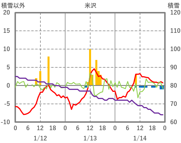 | 日 | 時 | 気温 | 降水 | 風向/風速 | 日照 | 積雪 | 降雪 |