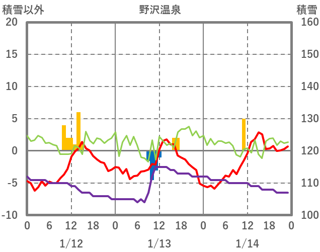 | 日 | 時 | 気温 | 降水 | 風向/風速 | 日照 | 積雪 | 降雪 |