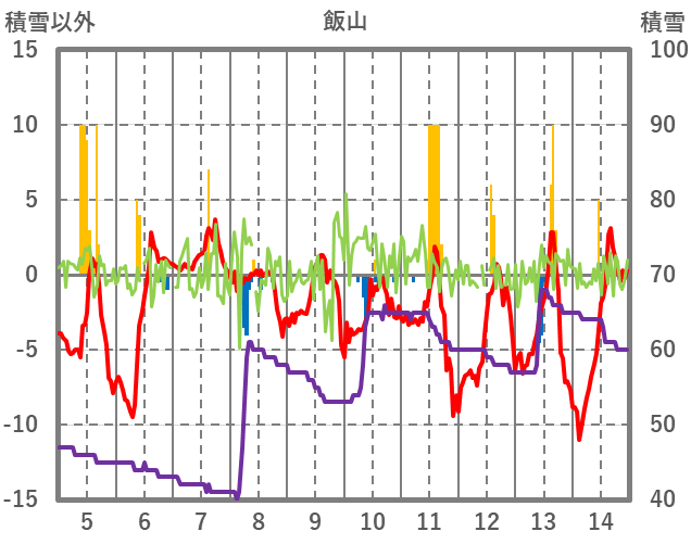 | 日 | 時 | 気温 | 降水 | 風向/風速 | 日照 | 積雪 | 降雪 |