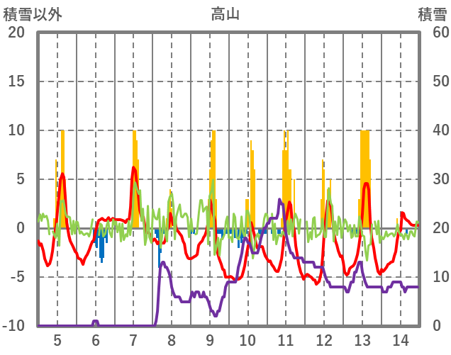 | 日 | 時 | 気温 | 降水 | 風向/風速 | 日照 | 積雪 | 降雪 |