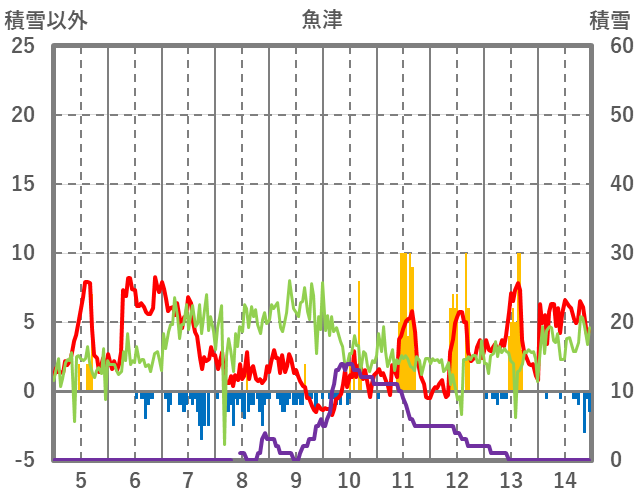 | 日 | 時 | 気温 | 降水 | 風向/風速 | 日照 | 積雪 | 降雪 |