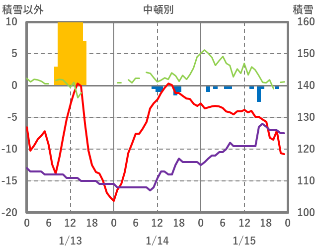 | 日 | 時 | 気温 | 降水 | 風向/風速 | 日照 | 積雪 | 降雪 |