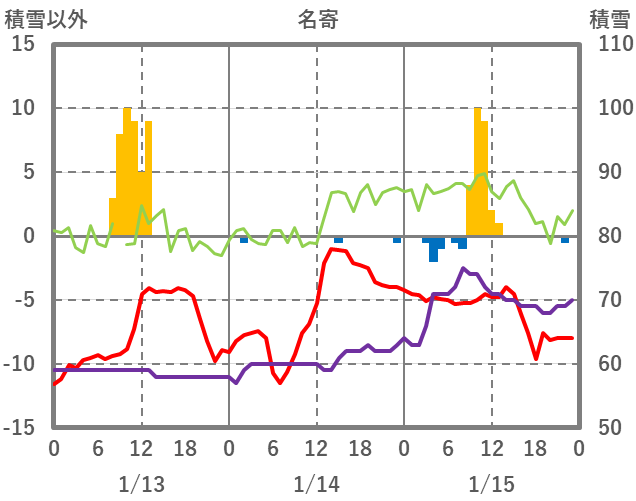 | 日 | 時 | 気温 | 降水 | 風向/風速 | 日照 | 積雪 | 降雪 |