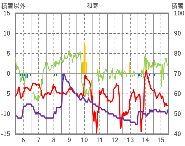 | 日 | 時 | 気温 | 降水 | 風向/風速 | 日照 | 積雪 | 降雪 |