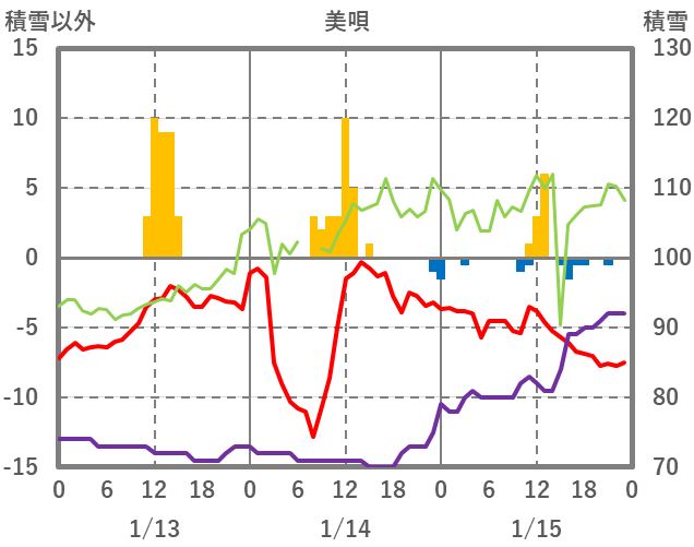 | 日 | 時 | 気温 | 降水 | 風向/風速 | 日照 | 積雪 | 降雪 |