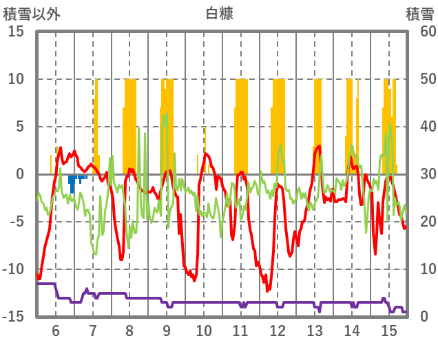 | 日 | 時 | 気温 | 降水 | 風向/風速 | 日照 | 積雪 | 降雪 |
