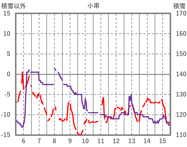 | 日 | 時 | 気温 | 降水 | 風向/風速 | 日照 | 積雪 | 降雪 |