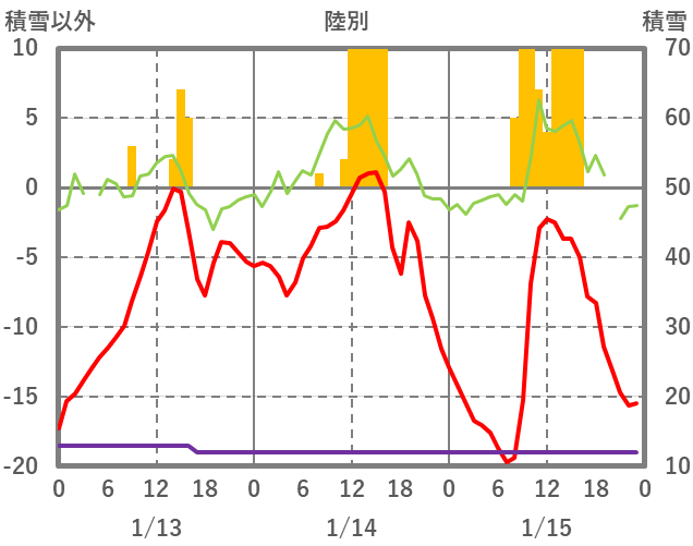 | 日 | 時 | 気温 | 降水 | 風向/風速 | 日照 | 積雪 | 降雪 |