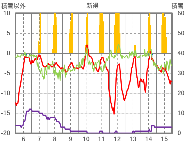| 日 | 時 | 気温 | 降水 | 風向/風速 | 日照 | 積雪 | 降雪 |