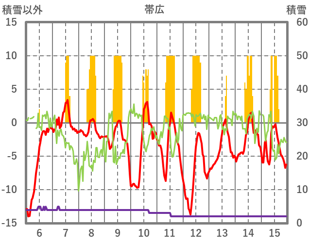 | 日 | 時 | 気温 | 降水 | 風向/風速 | 日照 | 積雪 | 降雪 |